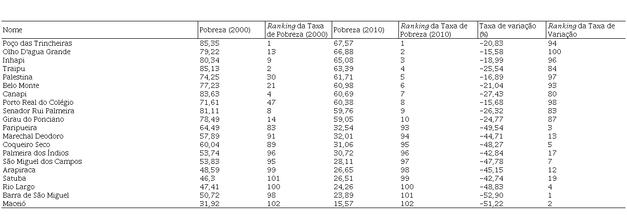 Vale ressaltar que, entre o período de 2000 e 2010, todos os municípios do Estado de Alagoas conseguiram reduzir as suas taxas de pobreza. Entretanto, observa-se um paradoxo nesses resultados, pois os dez municípios com os maiores índices de pobreza em suas populações foram aqueles que apresentaram as menores reduções entre o período analisado.