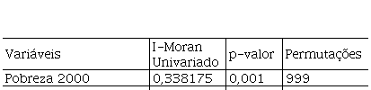 O resultado ilustrado anteriormente pela Figura 1 parece indicar uma semelhança na taxa de pobreza entre os municípios vizinhos. Contudo, é necessário fazer os cálculos de dependência espacial para comprovar essa afirmação.