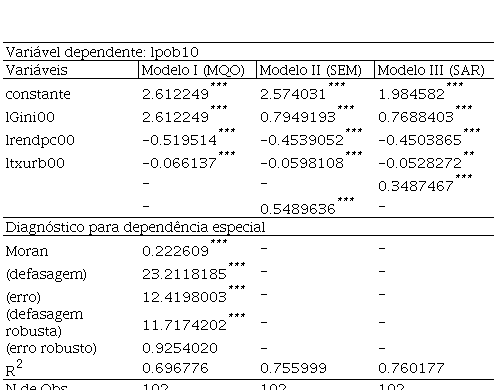 Seguindo a metodologia de Florax, Folmer e Rey (2003) para decidir o modelo mais apropriado que analisa os determinantes da pobreza, inicialmente foi estimado o modelo utilizando a metodologia de MQO desconsiderando os efeitos espaciais, apresentado na primeira coluna da Tabela 6. Porém, sabe-se que, uma vez detectada a autocorrelação espacial – o que justifica a utilização das técnicas de econometria espacial – é necessário definir o modelo, isto é, o modelo de defasagem espacial ou o modelo de erro espacial, que melhor se adeque à análise.