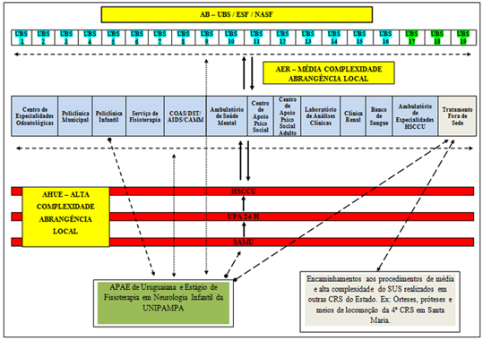 Legenda: AB: Atenção Básica; UBS: Unidade Básica de Saúde; ESF: Estratégia Saúde da Família; NASF: Núcleo de Apoio a Saúde da Família; AER: Atenção Especializada em Reabilitação; AHUE: Atenção Hospitalar de Urgência e Emergência; HSCCU: Hospital Santa Casa de Caridade de Uruguaiana; UPA: Unidade de Pronto Atendimento; SAMU: Serviço de Atendimento Móvel de Urgência; SUS: Sistema Único de Saúde; CRS: Coordenadoria Regional de Saúde; APAE: Associação de Pais e Amigos dos Excepcionais; UNIPAMPA: Universidade Federal do Pampa; COAS: Centro de Orientação e Aconselhamento Sorológico; CAMMI: Centro de Aplicação e Monitoramento de Medicamentos Injetáveis; DST: Doença Sexualmente Transmissível e AIDS: Síndrome da Imunodeficiência Humana.