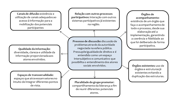Nessa linha, o Programa de Estudos em Gestão Social (PEGS) da Fundação Getúlio Vargas (FGV) elaborou 21 critérios de análise, a partir das seis categorias definidas por Tenório (VILLELA, 2012), em busca de compreender a cidadania deliberativa na prática. São, portanto, categorias que permitem identificar se um movimento atende a critérios de democracia deliberativa e incentiva a participação cidadã. Neste trabalho analisaremos uma dessas categorias: o processo de discussão.