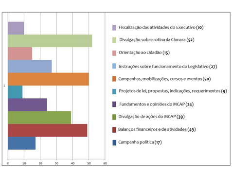 O terceiro aspecto para análise do critério de Qualidade da Informação refere-se à utilidade proporcionada aos atores envolvidos. Observamos que 52,7% das postagens direcionam-se ao incentivo à cidadania e ao controle social, incluindo campanhas para transferência de título de eleitor para o município, com explicações de como fazê-la, e coletas de assinatura para projetos de lei de iniciativa popular; mobilizações para melhorias na cidade – mutirões para tapar buracos nas ruas ou para estruturar bibliotecas em comunidades, por exemplo -; orientação sobre serviços municipais, acontecimentos na região e direitos a serem reivindicados, como o ressarcimento de parte do IPTU cobrado indevidamente, incluindo um formulário para fazer a solicitação; divulgação sobre a rotina da Câmara Municipal, convocando para sessões e audiências, e informando sobre os projetos legislativos tramitados na Casa; e divulgação sobre atos do Executivo, tanto cobrando transparência e posicionamentos quanto incentivando a população da cidade a realizar esse controle social.