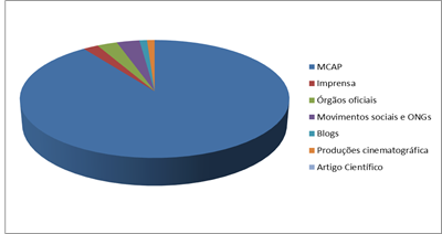 Quanto à origem do conteúdo divulgado, identificamos que o MCAP utiliza de informações oriundas de outras fontes, além dos materiais produzidos pelo próprio grupo (Figura 4). Os conteúdos de 262 postagens eram de autoria própria e 30 recorriam a outras fontes: movimentos sociais e organizações não governamentais (9), órgãos oficiais (8), imprensa (6), blogs (3), produções cinematográficas (3), artigo científico (1).
