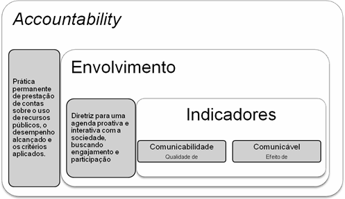 Por seu turno, a dimensão de accountability responde a uma dimensão externa dos indicadores, em que a prerrogativa do envolvimento social justifica a criação e a apresentação dos indicadores. O envolvimento traz consigo formas, meios e práticas que dotam os indicadores de comunicabilidade, enquanto propriedade desejável, e são comunicáveis, enquanto processo de compartilhamento dos “achados” com os públicos.