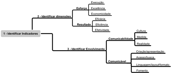 A partir desses elementos conceituais a metodologia de análise foi estabelecida em três momentos distintos: apresentar os indicadores; identificar as dimensões; identificar os elementos de envolvimento. No esquema abaixo apresenta-se o percurso do estudo.