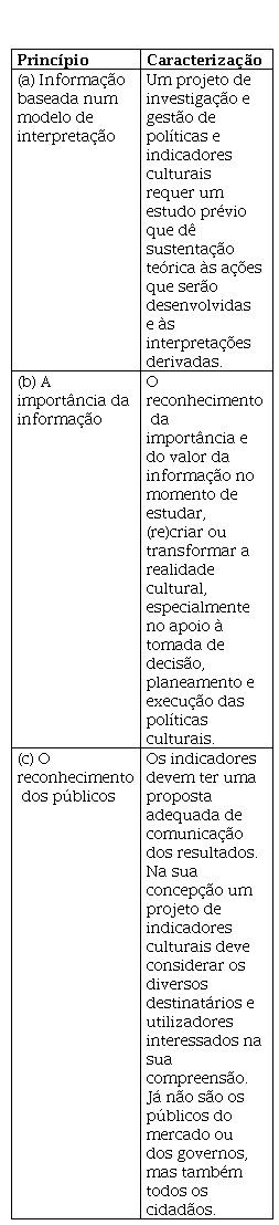 Comunicabilidade – qualidade do indicador enquanto ato comunicativo potencializado. A mensagem do indicador é clara, concisa, correta e admissível de interpretação fácil e integral. Pressupostos: perceber o conceito e a substantivação de um significado social (como é traduzida a cultura?); reconhecer a objetividade da informação (a medida é uma informação válida para perceber a realidade cultural?); perceber a mensagem como síntese interpretativa da realidade cultural (a fotografia da realidade é plausível de interpretação pelos públicos?).