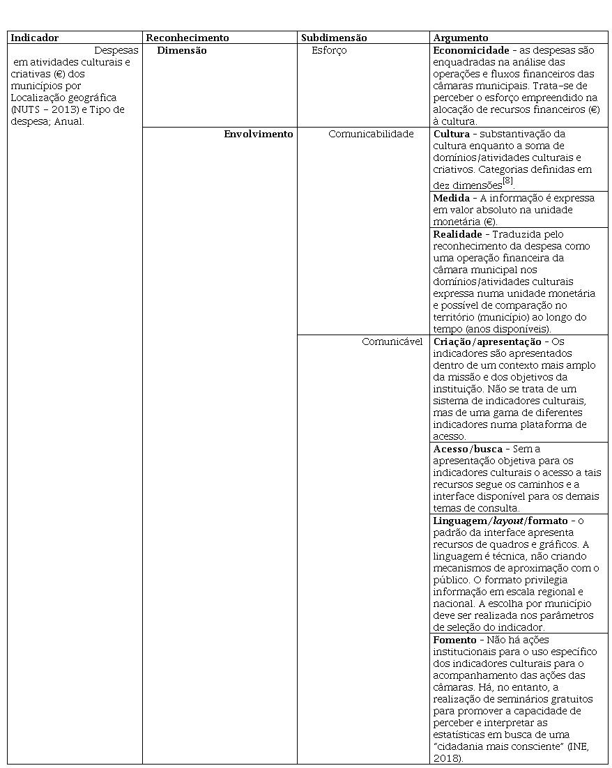 Assim, a identificação dos indicadores ocorreu pela consulta aos “dados estatísticos”, através do tema “cultura, desporto e lazer” com o subtema “cultura”. Isso permitiu visualizar doze tipos relativos à cultura e às câmaras municipais. Sinteticamente, os indicadores seguem o mesmo padrão de estrutura: despesa (representado pelo valor monetário – €); domínio cultural; escala (localização geográfica); período (ano disponível). Nessa ordem, a quantidade de indicadores justifica-se no reconhecimento do conceito e da substantivação de um significado social (como a cultura é traduzida). Assim, a cultura é interpretada por domínios culturais, tendo os seguintes indicadores de despesas das câmaras: