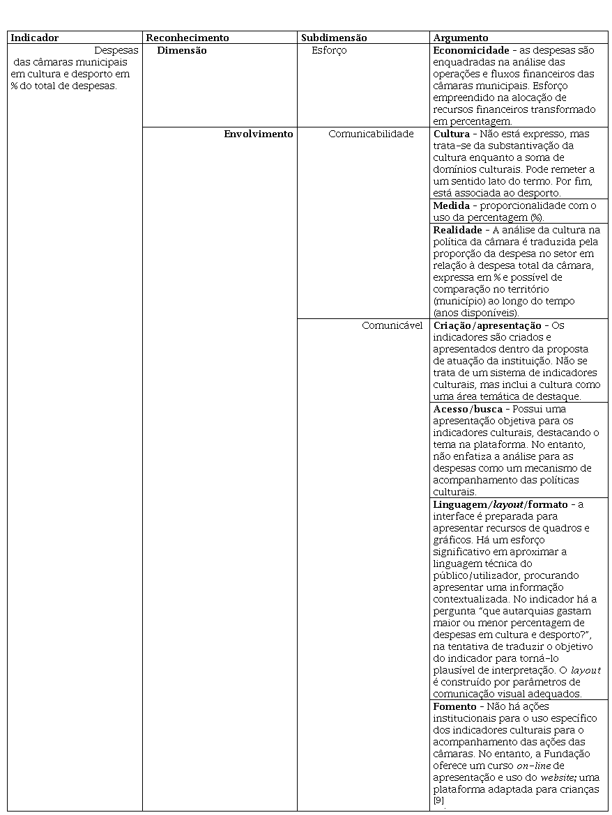 Nota-se que os argumentos estabelecidos pela tradução de cultura, medida válida para o indicador e realidade plausível de interpretação, conferem ao indicador uma qualidade adequada enquanto comunicabilidade. No entanto, é no estabelecimento de estratégias e técnicas que a proposta de torná-lo comunicável encontra barreiras. Nos elementos extrínsecos para disponibilizar, organizar, apresentar e fomentar o uso dos indicadores é que a comunicação não se efetiva em busca do envolvimento social nas políticas culturais das câmaras.