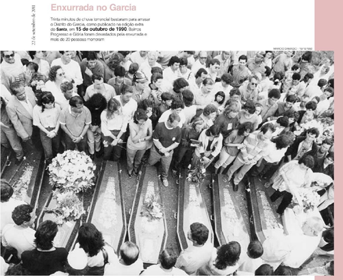 The tragic mass and flood movements that devastated the Glória and Progresso neighborhoods in 1990 reached 1,310 houses, of which 286 were damaged, and 66 were destroyed, leaving 754 people homeless (Bacca, 2000). This case had special coverage by Jornal de Santa Catarina, which reported the drama of the situation (Figure 2).