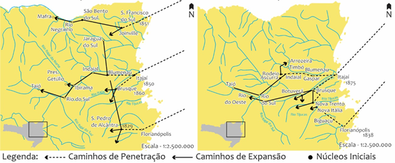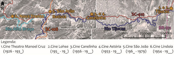 Portanto, para além da tese do desenvolvimento que adentra o Vale (neste caso, através do curso do rio e do caminho da atual SC 410) a partir da cidade polo-portuária, Tijucas, percebe-se que há outros caminhos para o desenvolvimento. Há um claro caminho que parte da região nordeste do estado, fruto da conexão do Vale do Tijucas com o Vale do Itajaí via Brusque, através da atual SC 108. Em adição, identifica-se também que os núcleos urbanos do Vale do Tijucas foram polarizados por outras cidades para além da sede (São Sebastião, hoje Tijucas), como Brusque, Blumenau e Florianópolis. Além disso, o fato de o Alto Vale não apresentar cinemas explica-se em função desta região estar relacionada à dinâmica do Planalto Serrano catarinense, portanto, pouco urbanizada.