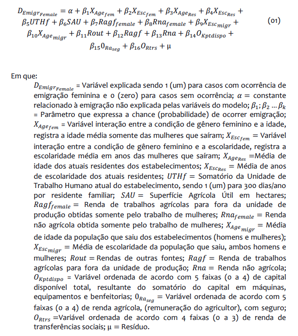 A análise dos dados sobre migração é feita por meio de duas ferramentas, uma primeira com a estatística descritiva, que avalia as informações tanto da emigração como imigração, e uma segunda ferramenta que é a análise inferencial, cujo objetivo foi avaliar somente as respostas sobre a emigração feminina, a partir dos dados cross section coletados entre junho e setembro de 2015. Sendo assim, a variável resposta (𝐷𝐸𝑚𝑖𝑔𝑟𝐹𝑒𝑚𝑎𝑙𝑒), descrita na equação 01, identifica os motivos ou respostas que levaram as emigrações femininas, registradas em 40 casos.
