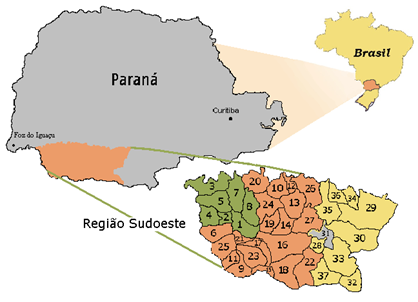 Nota: As microrregiões que compõe a mesorregião do Sudoeste do Paraná são: Capanema (municípios de números 1 a 8); Francisco Beltrão (9 a 27); e Pato Branco (28 a 37). O município de Itapejara d’Oeste se localiza na microrregião de Pato Branco, e está representado pelo número 31.
