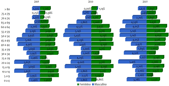 Na faixa de 0 a 14 anos a redução é substancial ao longo da série, correspondia a 21,62% em 2005, passou para 15,14% em 2010 e fechou 2015 com 14,59%, o que poderá representar menor contingente populacional nas faixas subsequentes nos próximos anos. Fato que pode ser avaliado na análise da faixa etária de 15 a 29 anos, justamente a faixa etária com maior percentual do contingente populacional que emigrou dos estabelecimentos, conforme será detalhado mais adiante.