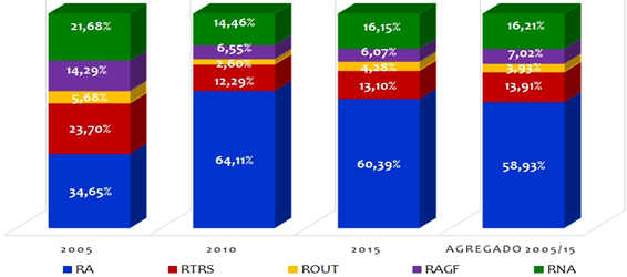 Nota: Ra: Renda Agrícola; RTRS: Renda de Aposentadorias, Pensões e Transferências; ROUT: Rendas de Outras Fontes; RAGF: Outras Rendas do Trabalho; RNA: Rendas de Atividades Não Agrícolas