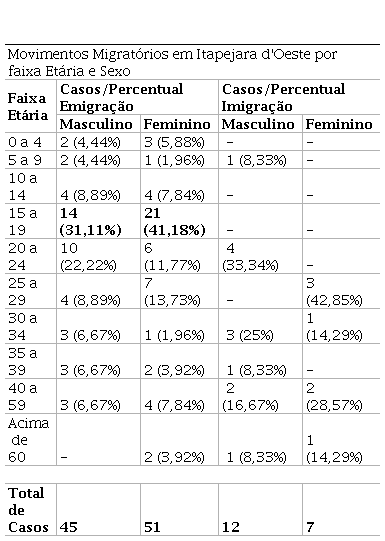 Além destes dados apresentados na Tabela 02, constatou-se com a pesquisa que o principal destino dos emigrantes homens são cidades da região (28,89% dos casos) e sede do município (24,44%). Já entre as mulheres, o destino principal são as outras cidades do Estado (27,45%) e para a sede do município (25,49%).
