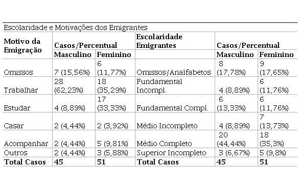 Os dados encontrados sobre as emigrações refletem o perfil destes homens e mulheres, e estão em consonância com as percepções teóricas. Paulilo (2009) e Zanini e Santos (2013), por exemplo, discutem sobre o integrante que assumirá as terras da família, aliado ao direcionamento dos investimentos em escolaridade como forma de compensar homens e mulheres que não assumirão as terras, um fato que levanta a necessidade de investigar a escolaridade desses emigrantes, motivações e destinos, ver Tabela 02.