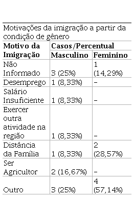 Grande parcela deste percentual de emigrantes (47,92% dos casos), saíram dos estabelecimentos entre 2010 e 2015. Os dados, revelam semelhança com a teoria em termos de quem recebe os investimentos em educação, principalmente, como forma de compensação aos não sucessores, visto que a emigração tem forte relação, pelo menos nos dados descritivos, com o nível mais elevado de escolaridade, e até mesmo pela busca de trabalho pelos não sucessores da terra. Por outra via, foram registradas algumas imigrações, sendo muitas delas de retorno destes emigrantes, conforme já apresentado na Tabela 01, mas vale entender o que motivou muitos destes retornos, ver Tabela 03.