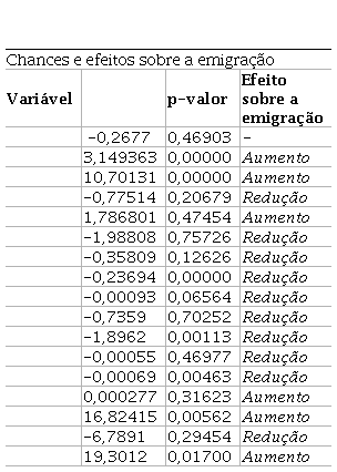 A não significância destas variáveis, como é o caso de algumas rendas, pode estar relacionada à ausência de valores em muitos casos e ao número de casos da amostra. Mesmo não sendo significativas, o sinal encontrado é condizente com o que se espera de resposta, por exemplo, para a superfície agrícola útil o sinal indica que a maior quantidade de terra leva a redução da chance de ocorrer a emigração, ou ainda o sinal encontrado na renda agrícola que indica redução das chances de ocorrer emigração, mas ambas insignificantes estatisticamente, sugere-se, para estas variáveis, estudos com maior quantidade de casos.