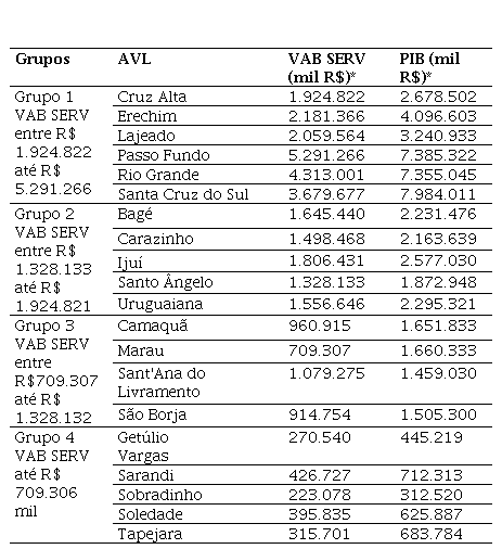 Os aglomerados escolhidos estão entre as 145 do estado de maior Produto Interno Bruto (PIB), Valor Agregado Bruto (VAB) e Valor Agregado Bruto de Serviços (VAB SERV) (FEE, 2017). O Valor Agregado Bruto (VAB) trata-se de um a medida de desempenho que retrata mais adequadamente a atividade econômica desempenhada pelas empresas analisadas no presente estudo. Nesse sentido, os aglomerados foram segmentados em quatro diferentes grupos formados de acordo com as faixas de valores de VAB SERV dos aglomerados – soma do VAB dos segmentos de serviços. Esses locais concentram 22% do total de VAB e 15% do total do PIB do estado do Rio Grande do Sul. A metrópole de Porto Alegre e a Capital Regional de Caxias do Sul foram excluídas em virtude de concentrarem 24% do PIB do estado, o que poderia enviesar os resultados da pesquisa. Ademais, foram desconsiderados o centro Sub-Regional de Frederico Westphalen, bem como aglomerados fronteiriços do Rio Grande do Sul com Santa Catarina, localizados no extremo norte gaúcho por sofrerem influência da polaridade exercida pela cidade de Chapecó, no oeste catarinense, de acordo com o REGIC (IBGE, 2007).