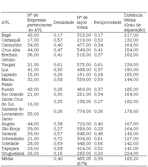 O objetivo deste estudo foi explorar as relações sociais existente entre empresas pertencentes a 20 AVLs e os dados dos desenvolvimentos econômicos regionais do Rio Grande do Sul. Por meio de uma abordagem quantitativa e utilizando o método de ARS, tornou-se possível apresentar os aglomerados onde as relações sociais são mais fortes e evidenciar que, nos aglomerados com maior Valor Agregado Bruto de Serviços, essas relações são mais fracas, em termos de densidade, número de laços, reciprocidade, outdegree, indegree e maior distância média. Dessa forma, o estudo contribui para o mapeamento dos aglomerados varejistas, do desenvolvimento regional das regiões estudadas e das relações sociais existentes entre as empresas desses aglomerados. Esse estudo avança ao evidenciar que existe uma relação entre o baixo nível de desenvolvimento de determinadas regiões que possuem relações sociais mais fortes. A união entre empresários é necessária nesses locais que possuem menor infraestrutura e recursos se comparados a outras regiões. Entender a relação entre o desenvolvimento econômico regional e as dinâmicas que ocorrem nos AVLs é algo extremamente relevante para políticas públicas. Governantes podem desenvolver programas estrategicamente direcionados para regiões de baixo VAB, trazendo o empresário para o centro do palco no desenvolvimento de tais projetos. Com base nesses resultados, acredita-se que haverá um protagonismo maior dos empresários desses AVLs locais com baixo VAB regional, pois são mais coesos entre si, dentro das redes informais que participam.