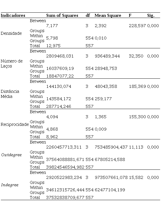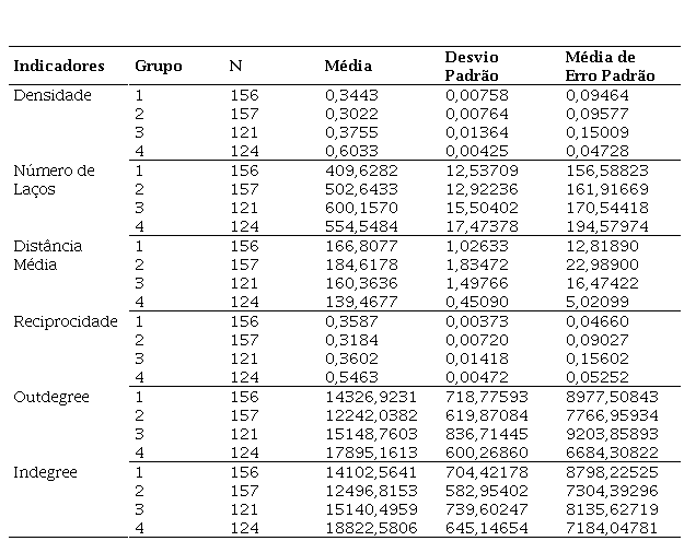 Os cálculos das métricas de ARS foram realizados com a utilização do software UCINET 6.0. Os testes estatísticos para análise das medidas de ARS entre os grupos designados foram realizados por meio do software SPSS v. 19. A comparação e o exame das diferenças entre os grupos foram realizados por meio da aplicação do Teste Anova (HAIR; BABIN; MONEY; SAMOUEL, 2009). Realizou-se também uma análise descritiva para explorar as características de cada um dos quatro grupos em relação as medidas de ARS. Os resultados encontrados são apresentados na próxima seção.