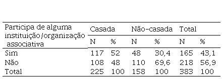 Em geral, a participação política - medida pela participação feminina em alguma instituição ou organização associativa - foi relativamente baixa: de um total de 383 mulheres que responderam a esta questão, 43,1% informaram participar de alguma instituição associativa, enquanto 56,9% disseram que não participam. Observe, ainda, que a participação política é significativamente maior entre as mulheres casadas (52%) comparativamente às não-casadas (30,4%).