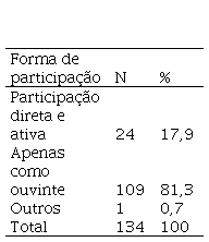 Em relação à frequência desta participação, os resultados mostram que apesar da maioria das mulheres participarem da vida política - 57,8% informaram participar de todas ou de quase todas as reuniões - elas o fazem praticamente na condição de ouvinte.