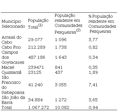 O Pescarte identificou 36 comunidades pesqueiras localizadas nos municípios estudados. As populações totais residentes nestas comunidades, por município selecionado, podem ser visualizadas na Tabela 1. Na mesma Tabela, constam também as populações residentes – estimadas pelo IBGE – nos municípios selecionados, em 2016, obtidas pelo site https://sidra.ibge.gov.br/tabela/6579#resultado. De acordo com nossas estimativas, em 2016, a população total residente nos municípios selecionados era de 1.067.272 habitantes e, de acordo com o Pescarte, a população residente nas comunidades pesqueiras era de 10.082 pessoas, ou seja, apenas 0,94% da população (Tabela 1). Como se pode notar, a população residente em comunidades pesqueiras é relativamente pequena em todos os municípios, porém mais expressiva em São Francisco do Itabapoana (7,41%), Arraial do Cabo (3,77%) e em São João da Barra (3,65%).