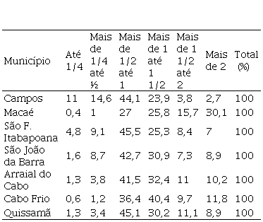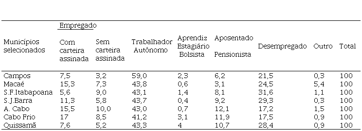 Como se pode notar na Tabela 4, os rendimentos auferidos pela População Economicamente Ativa (PEA) ocupada residente nas comunidades pesqueiras são, em geral, muito baixos: 69,7% da população residente em comunidades pesqueiras de Campos dos Goytacazes atingiram até um salário mínimo. Para São Francisco do Itabapoana esse percentual foi de 59,4%; para São João da Barra de 53,0%; para Quissamã de 49,79%; e para Arraial do Cabo de 46,5%. Em melhor situação encontravam-se as populações economicamente ativas ocupadas residentes em comunidades pesqueiras de Macaé (28,5%) e de Cabo Frio (38,2%).