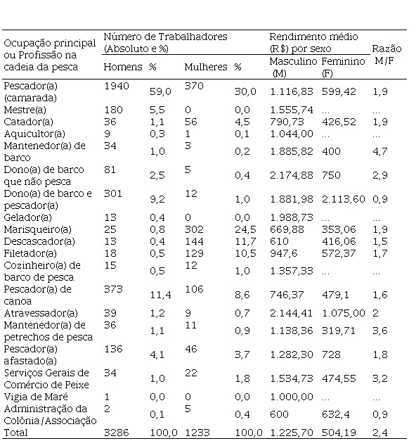 De um modo geral os resultados aqui apresentados indicaram que a pesca é também uma atividade feminina, apesar de nesse segmento do mercado de trabalho, assim como em tantos outros, haver significativa seletividade em relação ao gênero: o número de homens que atuam é bem maior que o número de mulheres.