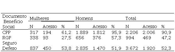 A posse do RGP é de particular importância porque esse documento é considerado a identidade do pescador e da pescadora e apenas através dele homens e mulheres pescadores têm acesso a alguns benefícios sociais, como: dar entrada na previdência social como segurado especial; direito de participar (quando emite o documento de aptidão ao PRONAF - DAP) de editais como do Pronaf e da Merenda Escolar (PNAE), dentre outros. Observe, na Tabela 6, que apesar de sua importância, é relativamente baixo o percentual de homens e mulheres que afirmaram sua posse. Nesse aspecto é importante elucidar que o acesso ao documento é, ainda hoje, restrito ao trabalhador (e à trabalhadora) que atua diretamente na captura. Outro problema que explica, em parte, o baixo número de trabalhadores com acesso ao RGP é o fato de que, desde 2014, o governo federal suspendeu a emissão de novos registros. Tais fatos confirmam, no caso dos homens, a invisibilidade conferida pelo próprio Estado (de fora para dentro) e, no caso das mulheres, além desta, a invisibilidade desde dentro, uma vez que mesmo aquelas que trabalham na captura não se reconhecem como pescadoras (elas próprias se veem como coadjuvantes) e não buscam o registro.
