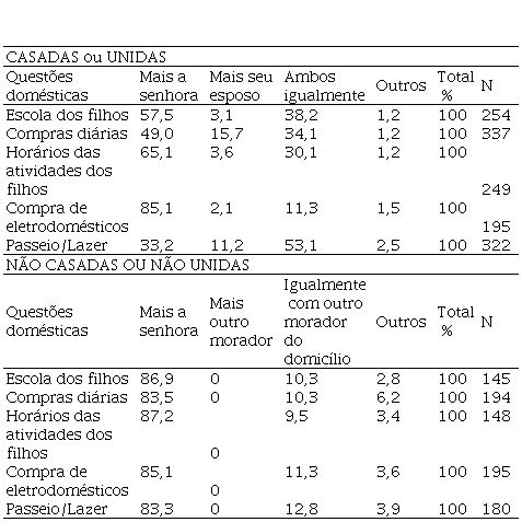 No âmbito doméstico, as responsabilidades sobre a realização das atividades cotidianas – limpeza da casa, cuidado dos filhos e dos idosos, dentre outras - normalmente cabem às mulheres, muito embora elas contem com a colaboração de outros membros do domicílio. Importante ressaltar, ainda, o importante protagonismo das mulheres nas decisões sobre os gastos da familiares.
