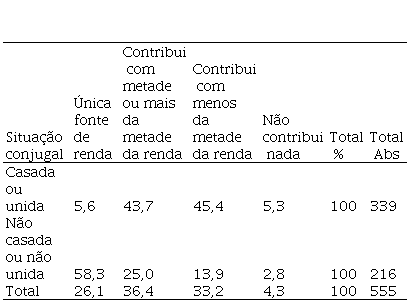 De um modo geral, os resultados indicam que o rendimento do trabalho feminino é uma importante fonte na composição do rendimento domiciliar, considerando-se que 62,5% das mulheres entrevistadas e que responderam a esta questão informaram serem responsáveis por pelo menos metade do orçamento familiar. Segundo a situação conjugal, 58,3% das mulheres não-casadas/não unidas e apenas 5,6% das mulheres casadas/unidas declararam que o rendimento proveniente do seu trabalho é a única fonte na renda da família; 33,9% das mulheres casadas informaram contribuir com a metade do orçamento familiar, ressaltando-se, ainda, que 23,6% declararam que contribuem pouco para a composição da renda familiar.
