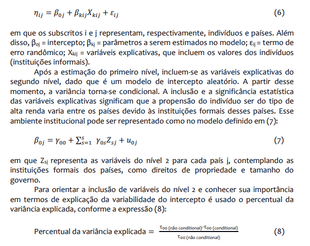 Dentro deste contexto, o objetivo deste artigo é avaliar como as instituições informais (valores dos indivíduos) e as instituições formais (indicadores de liberdade econômica) afetam o nível de renda individual. Ou seja, para além das relações no nível individual entre instituições informais e renda, as instituições formais dos países também podem afetar o nível de renda na escala micro. Para atendê-lo, dado que se incluem variáveis em diferentes níveis (indivíduos e países), lança-se mão do modelo de regressão logística hierárquico, tendo a categoria de renda individual como variável dependente.