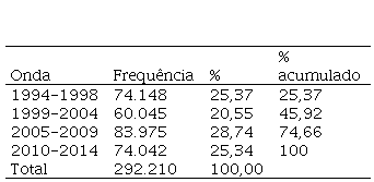 A base de dados do nível micro (indivíduo) é a Pesquisa Mundial de Valores (WVS), que é uma investigação mundial de mudança sociocultural e política2. A onda 2010-2014 se baseia em valores e crenças dos indivíduos de 97 países distribuídos por seis continentes. A escolha dos anos (ondas) se deu pela maior frequência observada a partir da onda 3, sendo este o corte temporal utilizado (1994-1998 a 2010-2014), num total de 292.210 indivíduos entrevistados (observações), conforme Tabela 1.