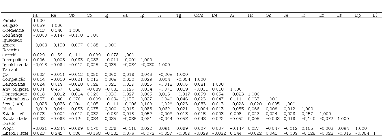 Destaca-se que a maior parte das variáveis é categórica (binária). Na Tabela 2, que considera variáveis do primeiro nível (indivíduos), notam-se distribuições percentuais distintas entre as variáveis. A variável de interesse, renda individual, está dividida em duas categorias, baixa e alta, e foi construída a partir de decis de renda. Aproximadamente, 60% da amostra está na categoria “baixa” e 31% está na categoria “alta”3. Considerando outras variáveis, do total de entrevistados no mundo, 48% são homens e 51% são mulheres; 70% acham “religião” um valor importante contra 27% que não acham; 38% concordam que homens tenham mais direitos do que mulheres, contra 57% que não concordam. Sobre confiança e democracia, 24% dizem confiar na maioria das pessoas, contra 70% que não confiam; 80% julgam a democracia um bom sistema político, contra 9% que não concordam. A Tabela 3 apresenta os dados da correlação simples entre as variáveis.
