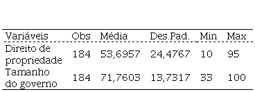 No segundo nível (dimensão formal) utilizou-se as variáveis extraídas da Heritage Foundation, especificamente do Index of Economic Freedom: “Direito de Propriedade” e “Liberdade Fiscal”. Cada variável refere-se a um tema relevante para instituições formais, as quais se referem ao Estado de direito e ao tamanho do governo, respectivamente. Segundo Miller e Kim (2016), ambas variáveis desempenham papel vital no desenvolvimento e manutenção da prosperidade pessoal e nacional. A análise descritiva dessas variáveis pode ser vista na Tabela 4.