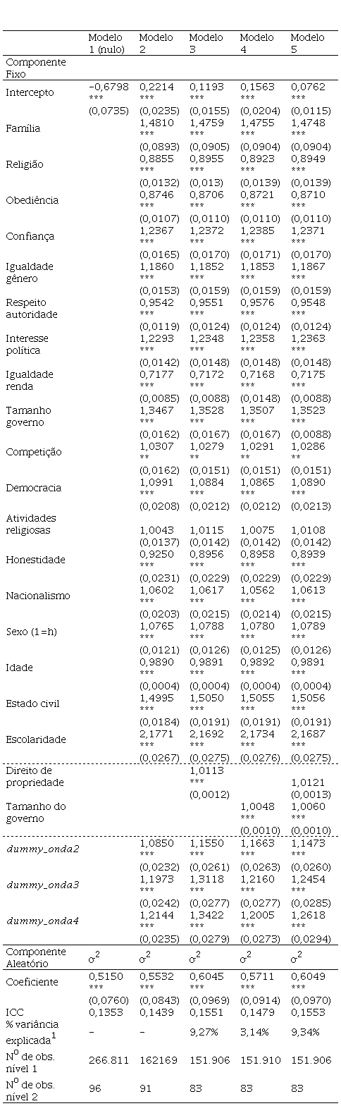 Considerando o Modelo 5, todas as variáveis de primeiro nível (com exceção de “atividades religiosas”) mostram-se significativas. Assim, percebe-se uma divisão em dois grupos de valores conforme a relação das variáveis com a renda individual. Instituições informais como a família, confiança, igualdade de gênero, democracia, nacionalismo, interesse por política, preferência por competição e por menos interferência do governo formam um grupo de variáveis que podem aumentar as chances do indivíduo ser do tipo “alta renda”. Ou seja, a maior parte desses elementos refere-se a valores de sociedades “não-tradicionais” e estes podem estar relacionados positivamente com a renda individual. No caminho inverso, valores mais “tradicionais” como a religião, obediência e respeito à autoridade possuem uma relação inversa com a renda individual, ou seja, podem reduzir a chance do indivíduo ser do tipo “alta renda”. Em relação aos coeficientes das dummies de tempo (ondas), cabe destarcar que estes apresentaram uma tendência de crescimento e, considerando o modelo 5 (completo), percebe-se uma tendência de elevação de acordo com as ondas.