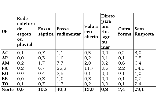 O acesso ao esgotamento sanitário é ainda mais precário, pois apenas 0,6% dos domicílios rurais da região Norte têm acesso à rede coletora de esgoto ou fluvial. A situação é mais grave no Pará onde o uso de fossa rudimentar (25,3%) e vala a céu aberto (11,7%) é prevalecente, conforme Tabela 9.