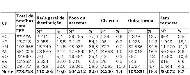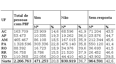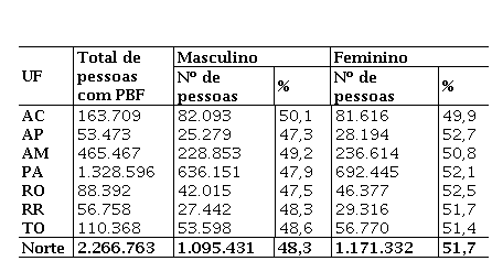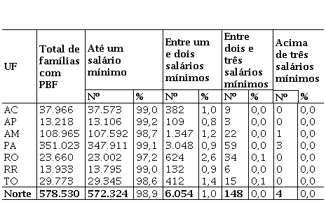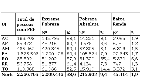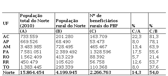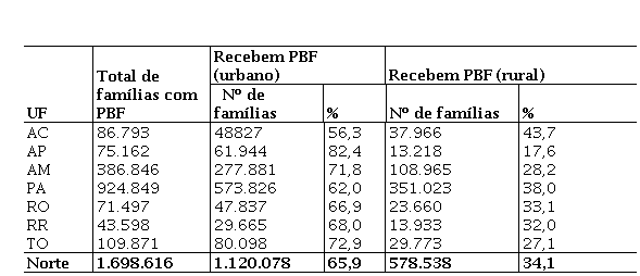 A região Norte é uma das regiões menos desenvolvidas do país e neste contexto o PBF tem um papel considerável para as famílias abaixo da linha da pobreza. No meio rural, o referido programa abrange cerca de 2,3 milhões de pessoas, englobando um contingente de quase 4,2 milhões de pessoas, ou seja, 54% da população rural da região. No estado do Acre, por exemplo, os beneficiários do PBF representam 81,3% da sua população rural total (201.280):