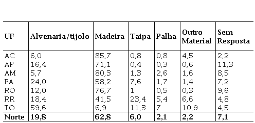Considerando as condições de moradia dos beneficiários do BPF no meio rural da região Norte, a maioria dos domicílios possui paredes de madeira (62,8%), seguida por alvenaria/tijolo (19,8%), taipa (6,0%) e palha (2,1%). Destacam-se os estados do Amazonas e Acre, cujas residências revestidas de madeira abrangem cerca de 80,3 e 85,7%, respectivamente. Parte desses domicílios estão isolados dos centros urbanos, tratando-se de comunidades remotas ribeirinhas. A Tabela 7 resume as informações acerca desses domicílios.