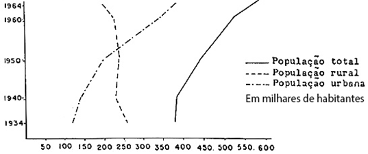 Esses complexos industriais contribuem tanto para o crescimento global da produção como também induzem no ambiente que estão instaladas, por gerarem “efeitos de encadeamento em direção à inovação, através de um processo de imitação, causando, por conseguinte, impulsos significativos sobre o desenvolvimento local e regional” (PERROUX, 1955, apud. DUARTE, 2015, p.199). Com isso, segundo Müller (1969), foram verificadas íntimas relações entre a indústria e o crescimento demográfico, criando-se um ciclo vicioso, em que a indústria atrai mais indústrias, incidindo no aumento da população, cujas necessidades almejam mais serviços e novas organizações industriais. A partir dessa dinâmica é possível identificar, no Gráfico 1, a evolução da população do Vale do Paraíba entre os anos de 1934 e 1964, cuja relação entre a população urbana e a população rural foi inversamente proporcional; ao mesmo tempo em que a densidade do meio rural diminuiu, cresceu consideravelmente a população dos centros urbanos.