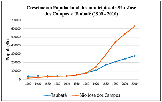 Percebe-se, no Gráfico 2, a diferença no crescimento populacional dos municípios de São José dos Campos e Taubaté de 1900 a 2010. A partir de 1960, Taubaté aumentou gradualmente sua população, enquanto o crescimento demográfico em São José dos Campos fooi exponencial, fato este que impactou não apenas o forte adensamento populacional em São José dos Campos, mas também a concentração das atividades produtivas, levando à inversão nos conceitos das potências valeparaibanas.