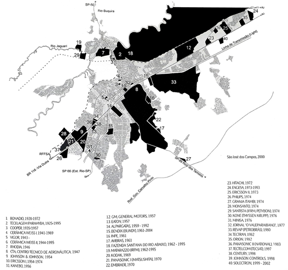 Após o golpe de estado civil-militar de 1964, houve uma mudança no sistema tributário por meio da criação do Imposto de Circulação de Mercadorias (ICM), do qual coube 20% aos municípios, de acordo com a arrecadação de cada um. Com isso, São José dos Campos teve seu orçamento elevado consideravelmente, devido ao grande número de indústrias instaladas o que, segundo Agê Junior (1981) proporcionou, ao município, invejável volume de recursos para obras públicas. A nova repartição de impostos possibilitou novas obras de infraestrutura, expansão das redes de água e esgoto, coleta de águas pluviais e extensão da iluminação pública aos bairros mais distantes da periferia. Como é possível notar, na Figura 2, o adensamento industrial no eixo da Ferrovia (1ª e 2ª fase de industrialização) e da Via Dutra (3ª fase de industrialização), marcou a configuração fragmentada da cidade.