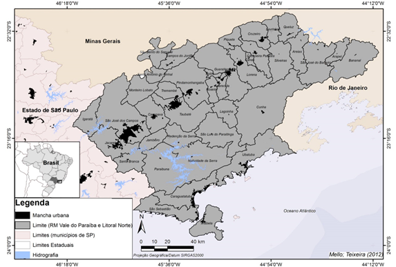 As características geomorfológicas do Vale do Paraíba em forma de canal constituem, mais que fatores de ordem econômica, condicionantes propícias às formações urbanas encadeadas. As vantagens competitivas naturais da região facilitaram o sistema de locomoção e transporte, que acompanharam o curso do rio Paraíba do Sul, conectando as cidades do Rio de Janeiro e São Paulo, enquanto, pelas gargantas das serras, permitiu a ligação entre o sul do estado de Minas Gerais com o litoral norte paulista (Figura 01). Nos séculos XVII e XVIII, período de afirmação da colonização portuguesa no sudeste brasileiro, o município de Taubaté atuou como um centro irradiador de monções e bandeiras até que, no século XIX, desempenhou, junto com outros municípios do Vale, forte influência no período cafeeiro, fator que promoveu o crescimento e a diversificação dos centros urbanos (MÜLLER, 1969).