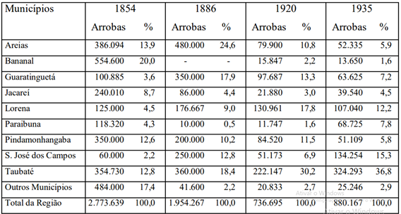 Paralelo a este momento, em 1935, Taubaté cooperava ativamente na produção nacional de café, atingindo em termos regionais seu auge em plena crise. Na tabela 1 é possível notar esse momento de destaque da cidade de Taubaté em 1935 em comparação a outros municípios que haviam dominado a produção em 1854, como Bananal, Areias e Pindamonhangaba.