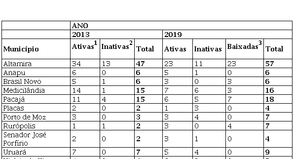 Em 2013, na região da Transamazônica e do Xingu, existiam 109 cooperativas, das quais vinte (20) ou 18,3% foram declaradas inativas pela Receita Federal porque há mais de três anos não prestaram nenhum tipo de informação ao órgão. Já em 2019, o número de cooperativas inativas subiu para trinta e sete (37) ou 26,1% das 142 cooperativas registradas. Quando somamos os inativos às quarenta (40) que foram baixadas, esse número sobe para setenta e sete (77) ou 54,2%. Isso mostra que, em 2019, mais da metade das cooperativas não tiveram nenhuma atividade econômica declarada na Receita Federal (ver Quadro 1).
