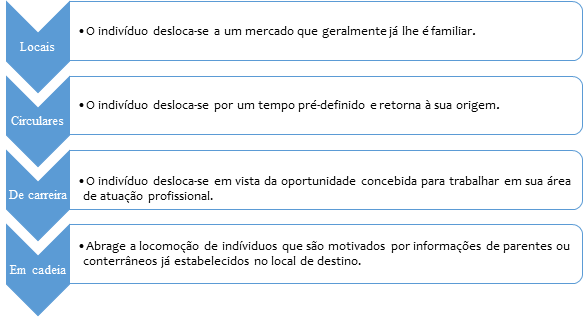 A figura acima exemplifica os tipos de mobilidades em processos migratórios e suas principais características. Para Truzzi (2008), os imigrantes pioneiros, especificamente os bem-sucedidos, servem como um elo de atração para o estabelecimento de outros imigrantes, os quais facilitam a fixação dos demais de forma permanente, além de determinar as profissões que irão ocupar. Portanto: