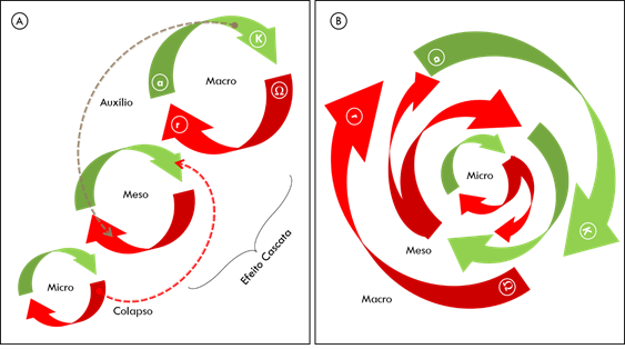 O mundo é organizado em hierarquias aninhadas de sistemas em diferentes escalas de espaço e tempo: células, árvores, ecossistemas, biomas; ou pessoas, famílias, comunidades, municípios, nações (BUSCHBACHER, 2014). Assim emerge o conceito de panarquia. O termo “panarquia”, incorporando o nome do deus grego da natureza, Pan, integra o modelo do ciclo adaptativo e a hierarquia aninhada de sistemas em diferentes escalas (ANGELER, 2016). A Panarquia integra o modelo de avalição do ciclo adaptativo (Figura 1). Basicamente refere-se às mudanças no sistema de escala maior que são tipicamente lentas quando comparadas àquelas em sistemas em escala menor, cujo ciclo adaptativo é mais rápido; as mudanças pequenas, mas frequentes nos sistemas menores, podem catalisar uma mudança no sistema maior (GARMESTANI et al., 2020; COSENS; GUNDERSON, 2018). Ou seja, o que ocorre em uma escala pode afetar outras escalas.