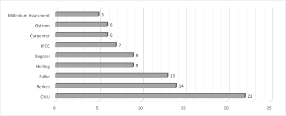 Os 24 artigos selecionados utilizaram um total de aproximadamente 1.246 referências. A área dos trabalhos identificados são, principalmente, planejamento urbano, geografia, sociologia ambiental, oceanografia e engenharia florestal. Os autores com maior número de citações foram: os marcos regulatórios e agendas dos escritórios especializados da Organização das Nações Unidas; Fikret Berkes Carl Folke; Crawford Stanley Holling; Alpina Begossi; Intergovernmental Panel On Climate Change (IPCC); Elinor Ostrom; Stephen Carpenter; Millenium Ecosystem Assessment e; Bryan Walker (Figura 2). A produção científica concentrou-se nas seguintes publicações: Plos One; Environmental Monitoring and Assessment; Environmental Management; Ciência e saúde coletiva e; AMBIO: a Journal of the Human Environment.
